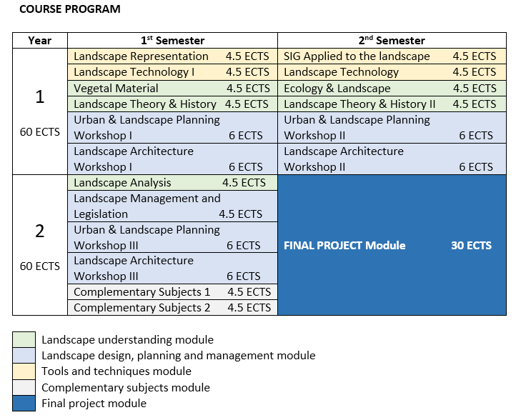The Landscape Architecture Master consists of 120 ECTS credits, of which 30 correspond to the Master's Final Project.